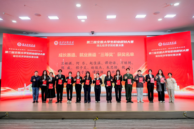 本网讯(通讯员:廖诗凡,审核:万庆召)2025年11月26日,以“筑梦青春志在四方,规划启航职引未来”为主题的第三届全国大学生职业规划大赛湖北经济学院校赛决赛在大学生活动中心二号报告厅圆满落幕。我院学子凭借清晰的职业蓝图、扎实的专业素养和自信从容的现场表现,在比赛中脱颖而出,斩获佳绩。其中,数媒艺术2341班张嘉琪同学荣获就业赛道二等奖,数媒艺术2341班谭晓微同学荣获成长赛道三等奖。