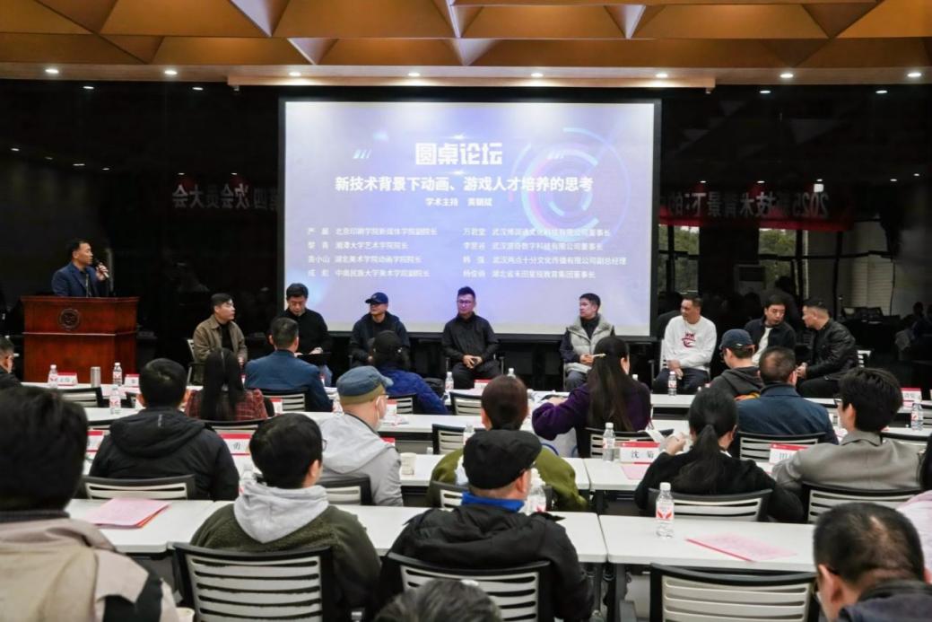 随后举行的圆桌论坛以“新技术背景下,动画、游戏人才培养的思考”为主题,由湖北经济学院艺术设计学院黄朝斌教授主持。学界与业界代表包括北京印刷学院新媒体学院副院长严晨、湘潭大学艺术学院院长黎青、湖北美术学院动画学院院长袁小山、中南民族大学美术学院副院长成彪、武汉博润通文化科技股份有限公司董事长万君堂、武汉渲奇数字科技有限公司董事长李昱谷、武汉两点十分文化传播有限公司副总经理韩强、湖北省禾田星锐教育集团董事长杨俊俏等,围绕产教融合、核心能力培养、校企协同等议题展开深度对话。