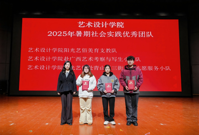 “扎根基层·担当铸魂”暑期社会实践表彰环节,集中展示了学院“实践育人”的显著成效。2025年暑期,学院精心组建的8支实践团队、257名学子深入基层,在乡村振兴、社区服务、美育支教等领域贡献青春力量,荣获暑期社会实践优秀组织奖等多项荣誉。“阳光艺佰”美育支教队等优秀团队以及优秀指导老师等个人代表上台领奖,他们的成果生动诠释了艺术师生用专业知识服务社会的责任与担当。院长顾琛教授为获奖代表颁发荣誉证书。