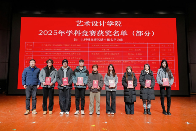 在“赛场亮剑·创意争辉”学科竞赛表彰中,学院学子在过去一年的优异成绩令人瞩目。据统计,学院共斩获A类省级以上学科竞赛奖项324项,其中国家级奖项101项。获奖代表们的昂扬精神让现场师生直观感受到了艺术设计的无限魅力与学子们的创新精神。副院长张洋为获奖代表颁发荣誉证书。