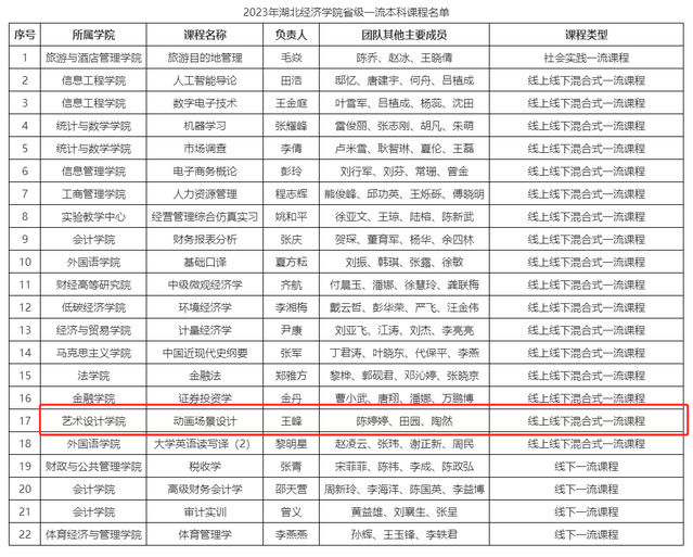 本网讯(通讯员李孟娟) 近日,省教育厅公布了2023年度省级一流本科课程认定结果,我校22门课程入选,我中心王峰、陈婷婷、田园、陶然四位研究员负责的《动画场景设计》课程获批。